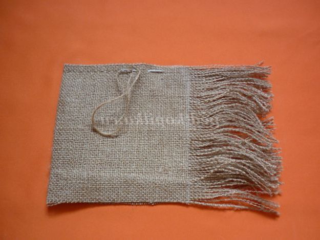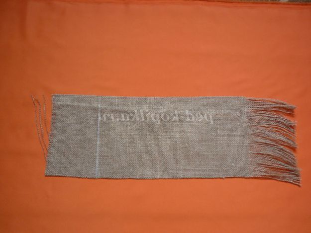 Візьміть шматочок мішковини розміром 16/50 см, добре отпарьте мішковину праскою. На відстані 10 см від кожного краю прочертите крейдою лінію.