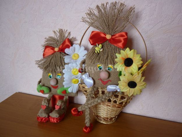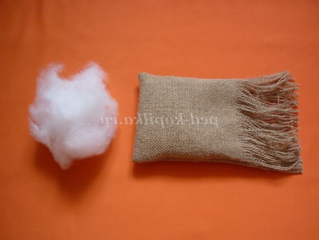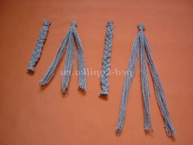 Шматочок мішковини 25/16 розпустіть на окремі ниточки. З довгих ниток робимо ніжки, а з коротких - руки. Робимо два пучки по 45 ниток для ніг і два пучки по 45 ниток для рук. Заплітаємо косички.
