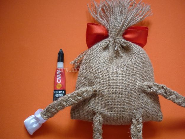 Зробіть надрізи на тильній стороні мішечка в місцях кріплення ніг і рук, вставте ручки і ніжки, закріпіть їх, використовуючи клей.