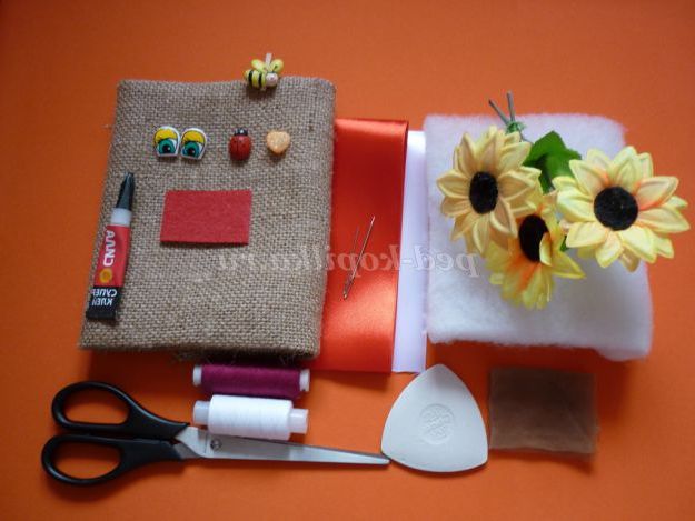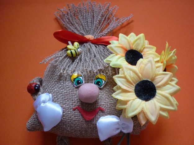 Декількома стібками закріпіть на мішечку ручки. Приклейте бджілку і божу корівку. Їх залучили наші соняшники.