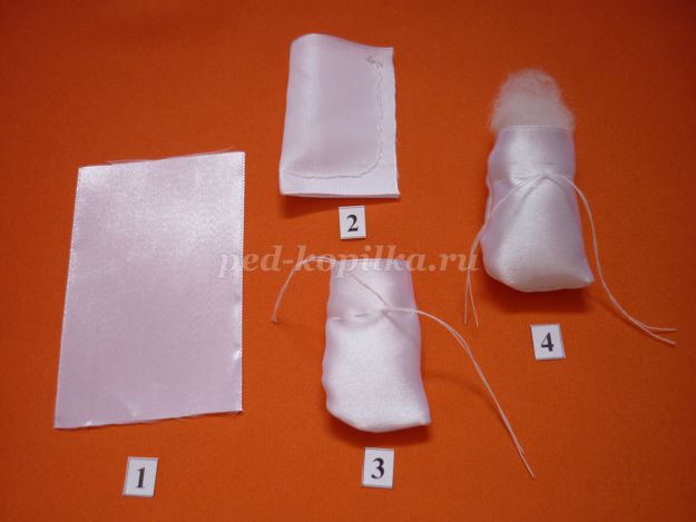 Відріжте 2 шматочки білої стрічки по 7 див. Будемо шити рукавиці. Зігніть стрічки навпіл і прошийте, як показано на фото. Виверніть на лицьову сторону. По колу зробіть сходинку, покладіть в рукавиці трохи синтепону для обсягу.