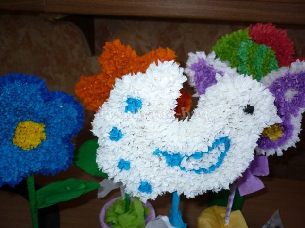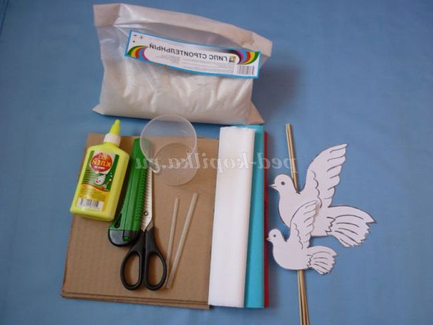 Палички, на яких кріпляться голуби, обернем білим папером і з невеликої червоної смужки паперу завяжем бантик.