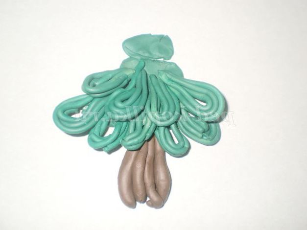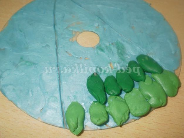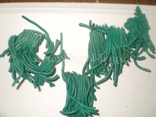 пластилін зеленого кольору видавити через часникодавку.