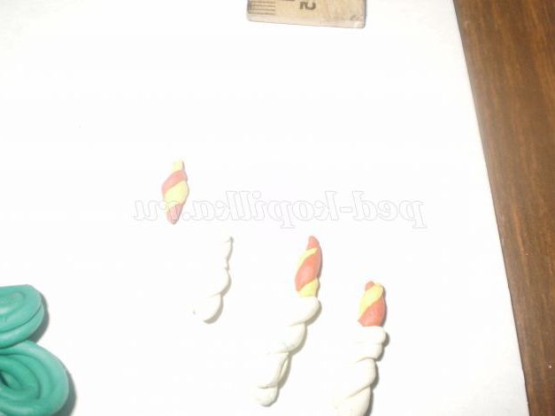 Для прикраси робимо свічки і банти. Розкачати дві невеликі ковбаски,перевити їх між собою. Також робимо і полум'я свічки у