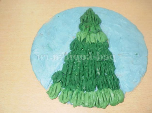 у нижній частині аркуша робимо стовбур і накладаємо пластилін зеленого кольору у вигляді трикутника. Формуємо з "локшини" крапельки. Укладати починаємо з нижнього ряду