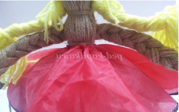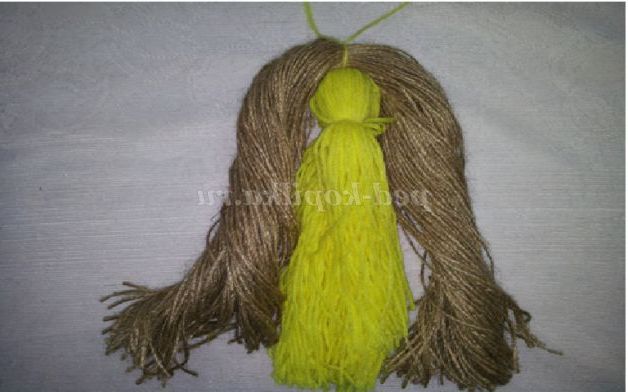 5.Подвязываем волосся до раніше підготовленого тулуба лялечки в середині моточка, це буде верхівка голови.