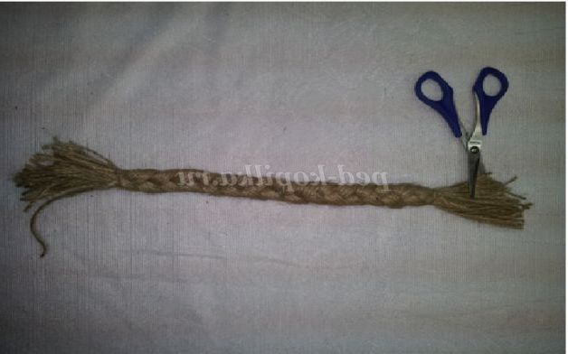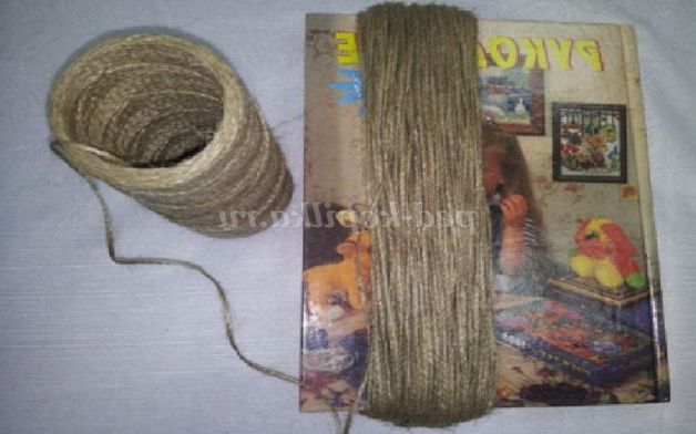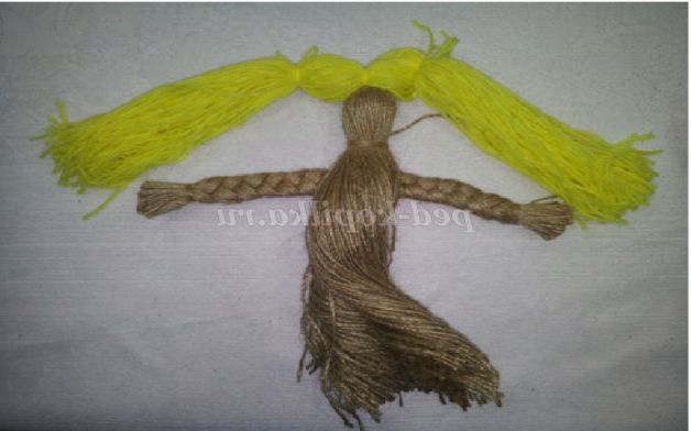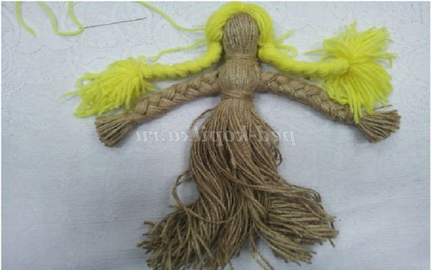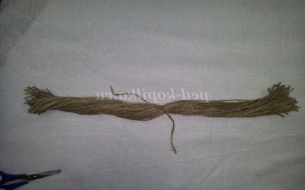 1.Туловище лялечки робимо шляхом намотування джутової нитки на основу, це буде висота ляльки, включаючи голову.