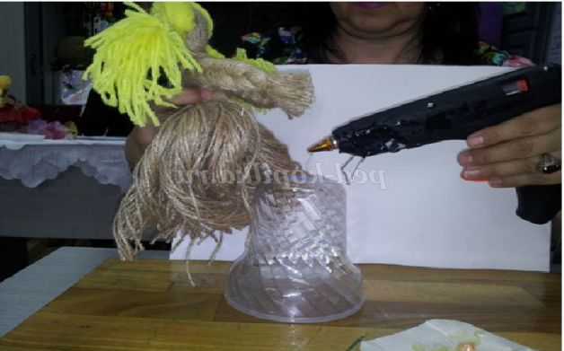 18.Соблюдая запобіжні заходи з'єднуємо ляльку з коробочкою методом склеювання.