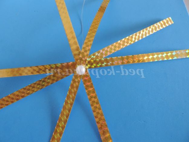 1. Нарізаємо смужки шириною 1см з голографічного картону сріблястого кольору. (8 смуг довжиною 25см і 5 смуг довжиною 14 див.) і товстою голкою проколюємо смужки в середині і по краях.