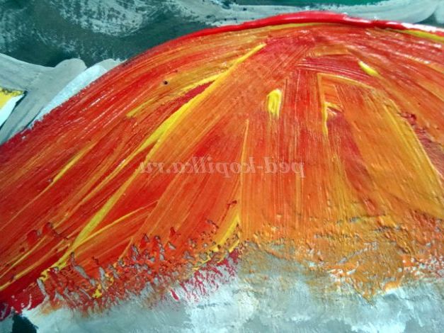 Промиваємо пензель витираємо її про серветку. Не чекаючи висихання червоного кольору, малюємо жовті пасма.