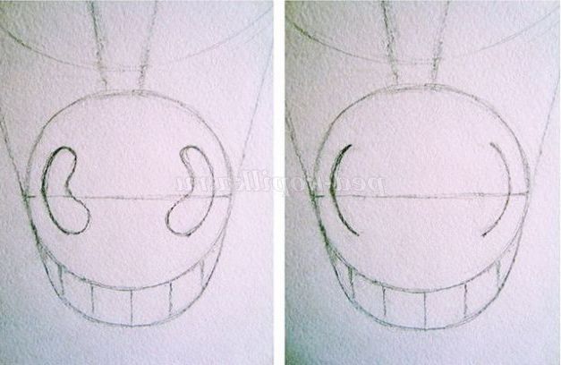 Ділимо велике коло на дві рівні частини, проводимо горизонтальну лінію. Для очей малюємо лінії навскоси, довжиною в три пальчика. Додаємо дуги зверху і знизу. Вийшли очі примружено!