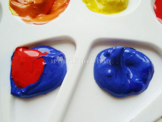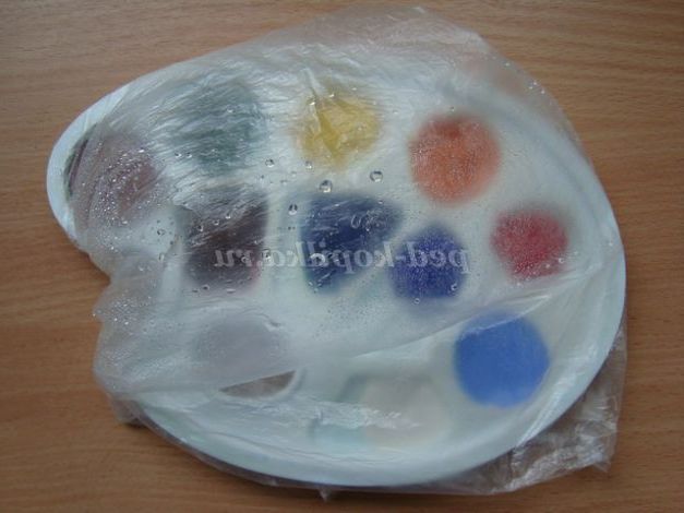 4. Якщо фарби змішані, йде процес малювання, а виникла необхідність зупинитися на тривалий термін? Беремо целофановий пакет, бризкаємо в нього води і кладемо палітру. Пакет, злегка, надуваємо, закриваємо краю.