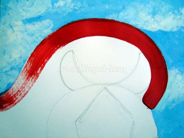 Переходимо до малювання чубчика. Беремо тонку круглу кисть №3, набираємо червону гуаш, малюємо червоні пасма.