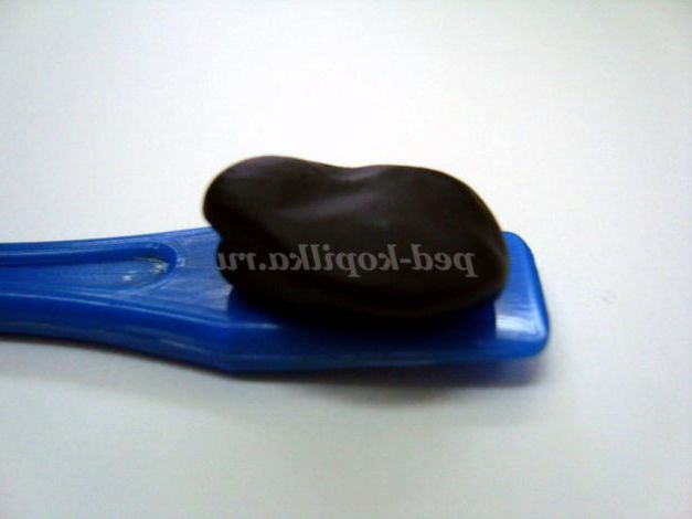 Залишилося отримати відтінки коричневого кольору: шоколадний і кава з молоком. Для цього викладаємо у дві комірки червону гуаш (бобові зернятка). В обидві додаємо по горошині зеленої фарби. Перемішуємо, дивимося, щоб відтінок виходив смачний шоколадний! Якщо зеленуватий відтінок вийшов, значить, потрібно додати червоної фарби.