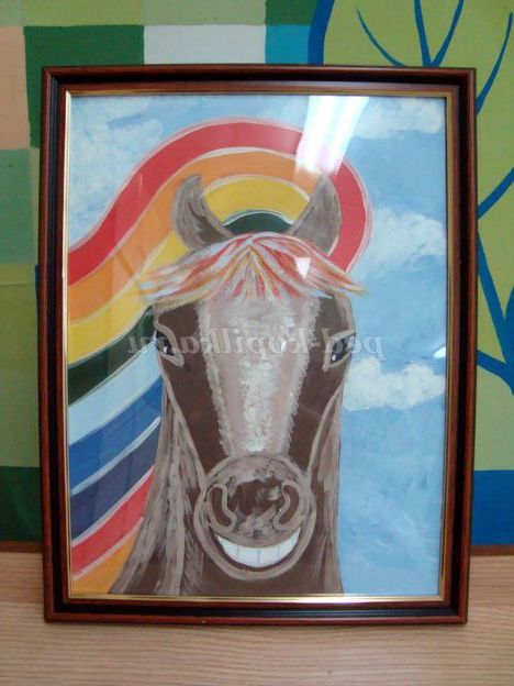 Шановні батьки, для виставки, дитячі роботи краще оформляти у паспортом і рамки. Ця, мило усміхнена конячка, намальована дівчинкою Женечкою, 6 років, зайняла 1 місце у Всеросійському конкурсі.