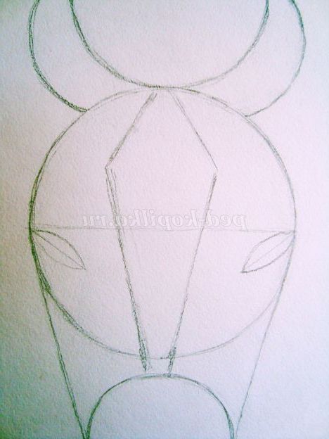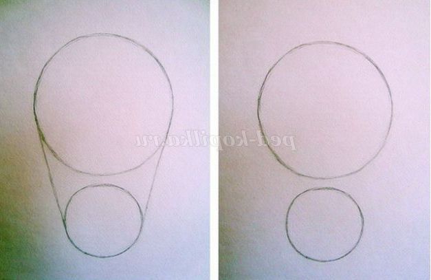 Переходимо до малювання на папері. В центрі аркуша малюємо коло великого розміру. Відступивши на два пальчика вниз, малюємо коло середнього розміру. Прямими лініями з'єднуємо кола.