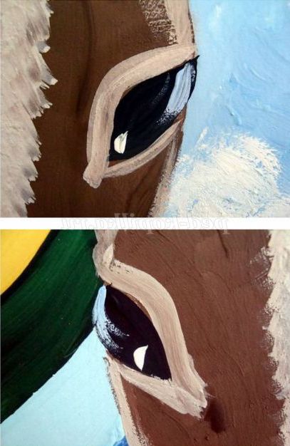 Плоскою кистю № 8 зафарбовуємо вуха шоколадним кольором. Вимальовуємо голову коня по контурах.