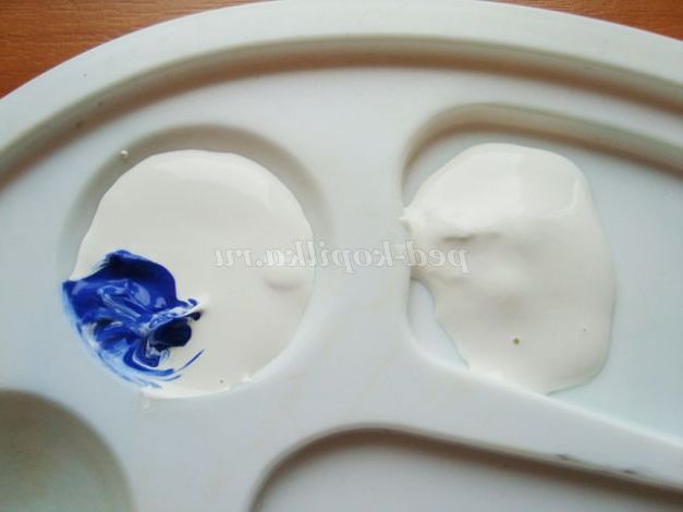 Отже, стеком викладаємо у дві комірки білу гуаш. До однієї додаємо синю фарбу, перемішуємо стеком, отримуємо приємний блакитний відтінок.