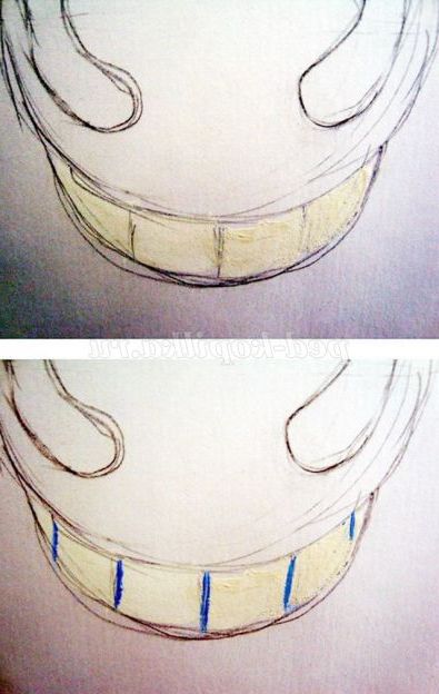 Беремо тонку круглу кисть №3 і білою фарбою акуратно зафарбовуємо зуби. Промиваємо кисть. Цієї ж пензликом малюємо проміжки між зубів.