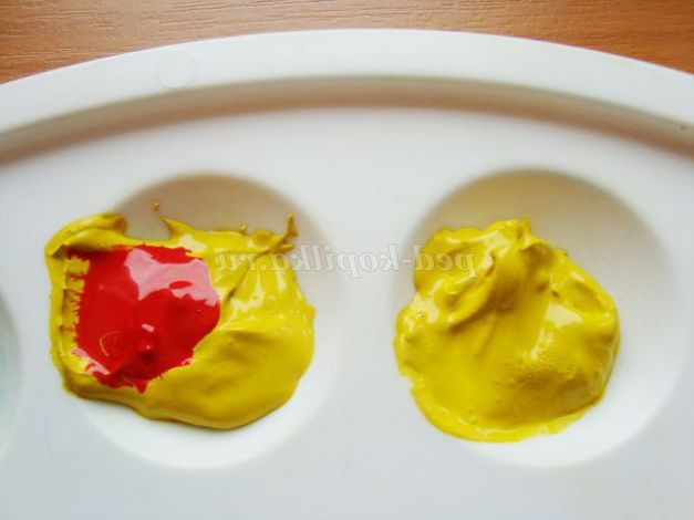 У дві комірки викладаємо жовту гуаш. В одну додаємо горошинку червоної фарби, перемішуємо, одержуємо жовтогарячий.