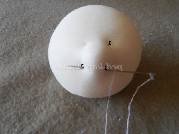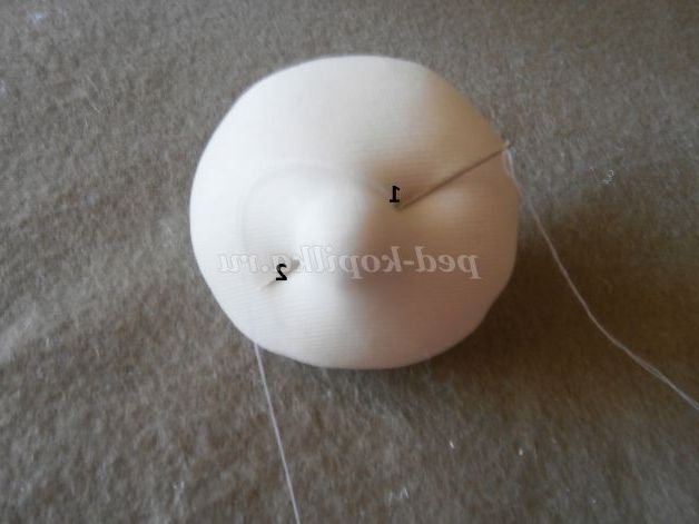 Приступаємо до формування мордочки. Вводимо голку з ниткою з виворітного боку і виводимо у верхньому лівому кутку від носика в цифрі 1, робимо стібок, виводячи голку в цифрі 2