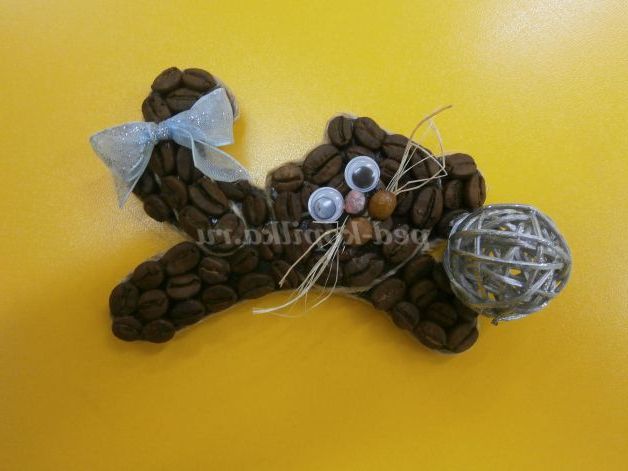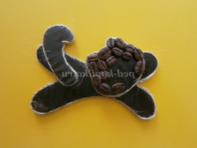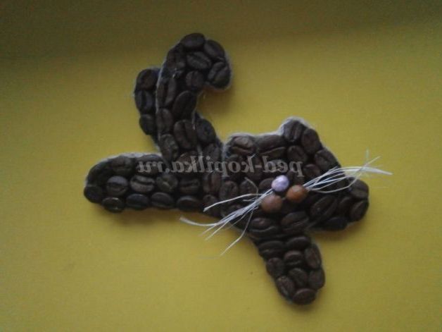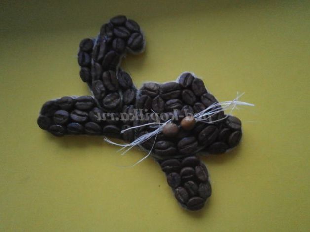 Склеюємо всі частини котика і починаємо декорувати зернами кави. Зернятка укладаємо смужечкою вгору, намагаючись підібрати їх за розміром так, щоб просвіти між ними були мінімальні