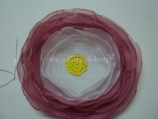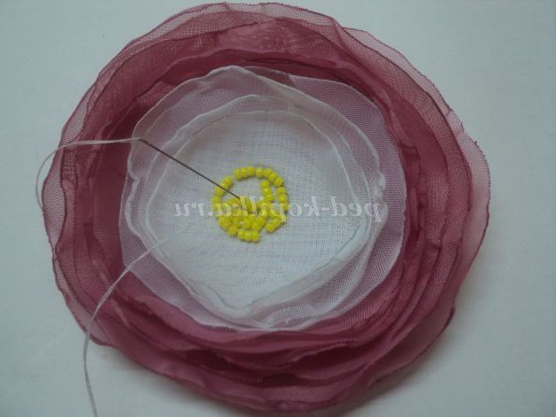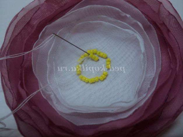 В центрі квітки простим олівцем малюємо коло. Його ми будемо заповнювати бісером жовтого кольору. Всуньте нитку в голку для бісеру, зробіть вузол. Проколіть голкою всі шари тканини і простягніть нитку. Приступаємо до вишивки серцевини. Спочатку вишьем контур кола. На голку наберіть 3 бісеріни і пришийте. Тепер англійську шпильку можна прибрати