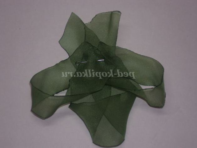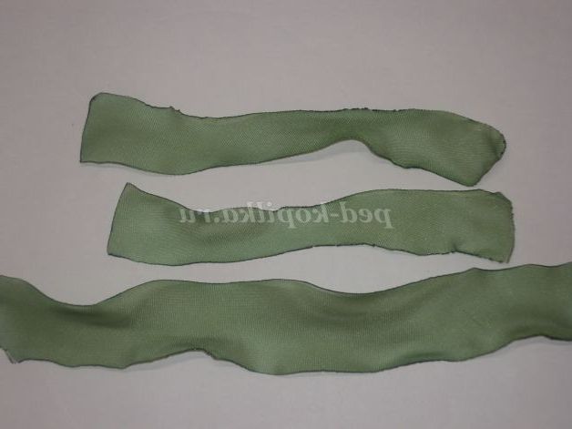 З тканини зеленого кольору з косою вирізаємо дві смужки довжиною 12см і одну смужку довжиною 18см. Ширина смужок 2 див. Обробляємо над полум'ям свічки.