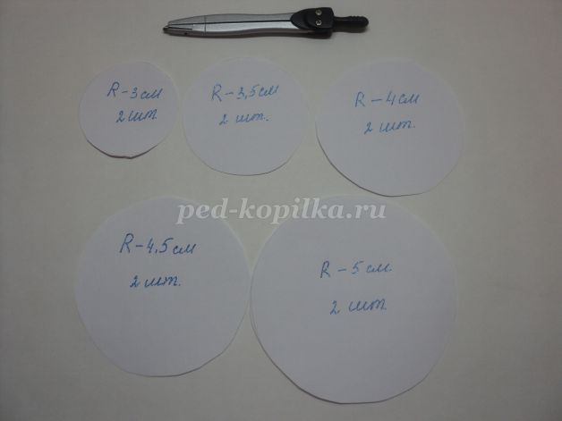 З допомогою циркуля креслимо на аркуші картону окружності радіусом 3 см; 3,5 см; 4 см; 4,5 см; 5 див. Акуратно вирізаємо отримані шаблони. Це шаблони для віночка квітки.