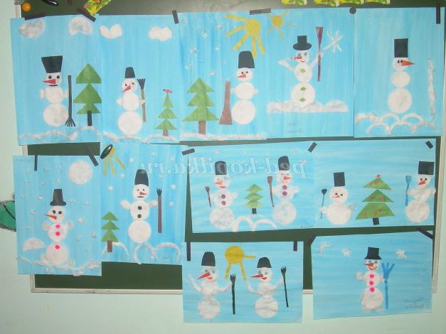 Обладнання: сніговики, ватяний м'який грудку, ватні диски, кисть, клейстер, кольоровий папір, ножиці.