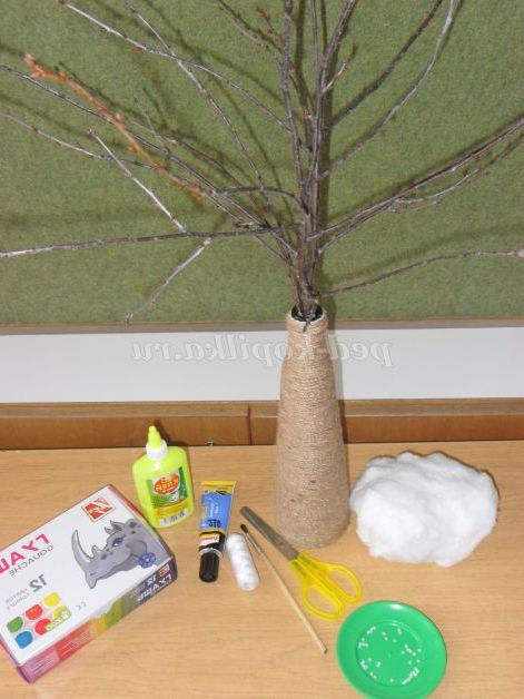Спочатку готуємо дерево - гільце. Беремо гілочку намазуємо клеєм ПВА і приклеюємо вату.
