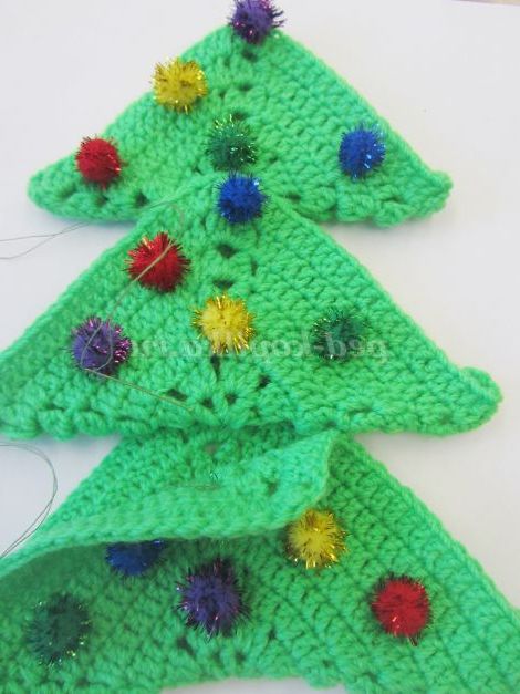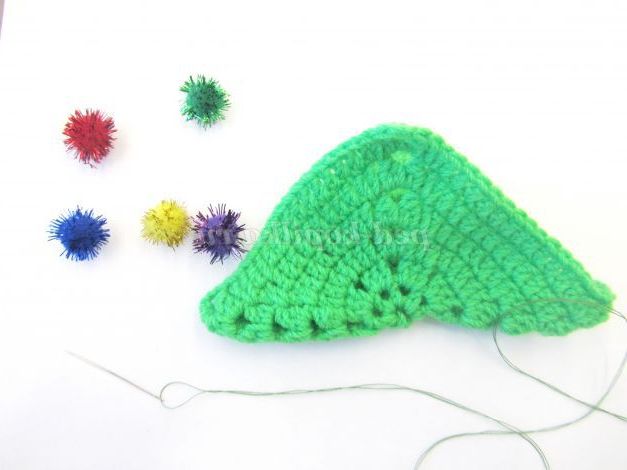 Потім помпончики пришиваємо до другого і третього квадратика. Закріплюємо верхівки.