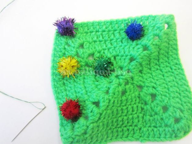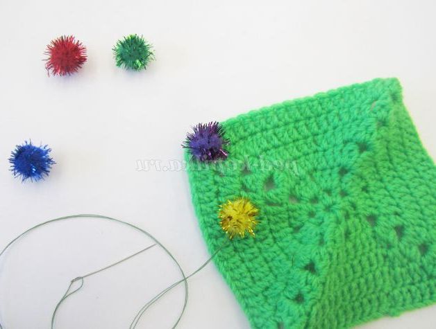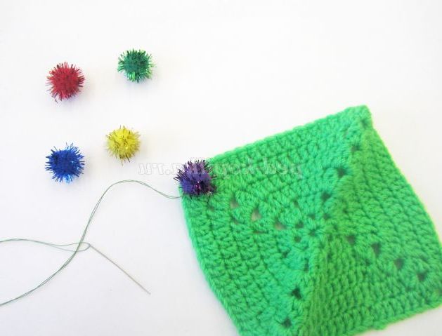 Готуємо нитку з голкою і помпончики, будемо пришивати до першого квадрату.