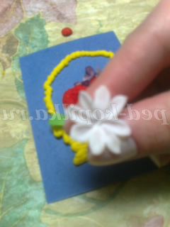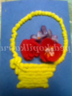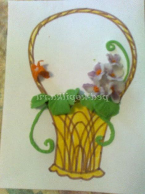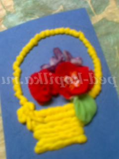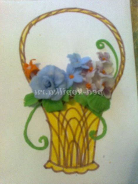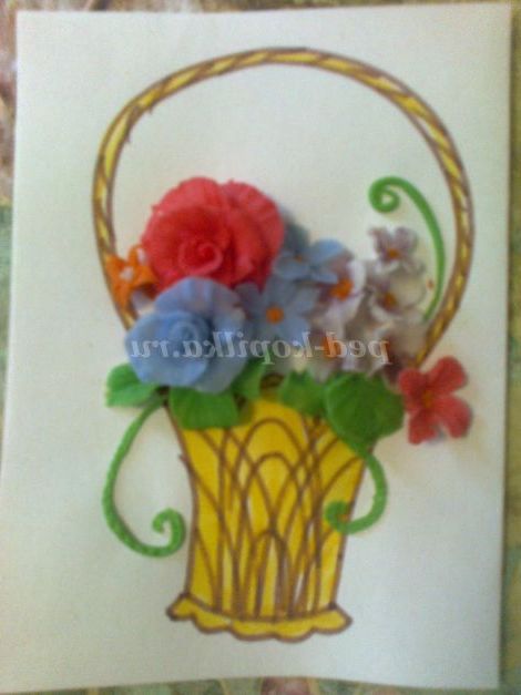 Такими квітами можна оформити вітальну листівку. Наприклад, кошик намалюємо фломастерами, а наповнимо її нашими квітами. Приклеюємо їх клеєм ПВА. Тримаються чудово.