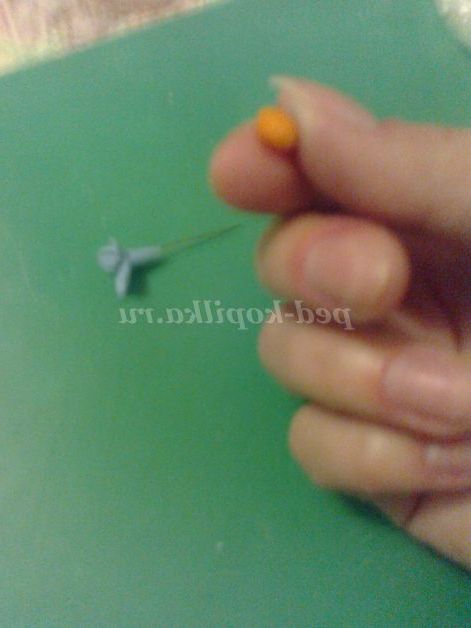 В серединку квітки покладемо жовту або помаранчеву крихітну горошинку і з допомогою зубочистки зробимо невеликі цяточки - вм'ятинки: