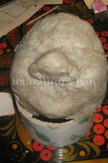 Фото №12: з'єднати голову з тулубом за допомогою зубочистки, але між ними сформувати шию, з якого або кільця (у мене, наприклад, це кільце від тонкого скотча),шматки маси пап'є-маше сформувати стопи ніг