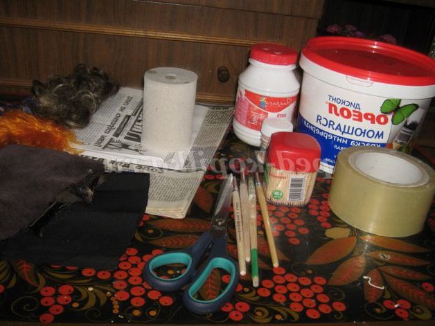 Фото №1: Для роботи приготувати ножиці, дві зубочистки, непотрібний папір, туалетний папір, скотч, клей шпалерний або ПВА, фарба акрилова для ґрунтовки, фарба тілесного кольору, тканина для штанів і для сорочок різних забарвлень, штучні волосся двох кольорів