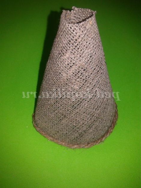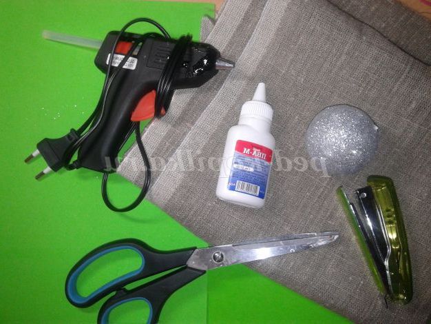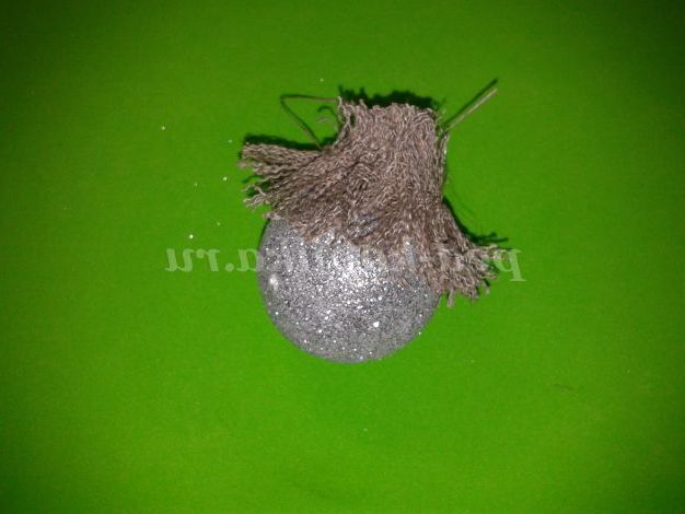 Матеріали: ялинкова куля з пінопласту, клей - пістолет, ножиці, клей ПВА, шпагат, мішковина.