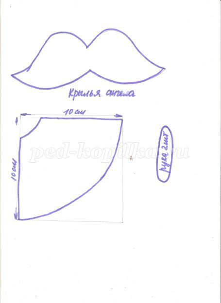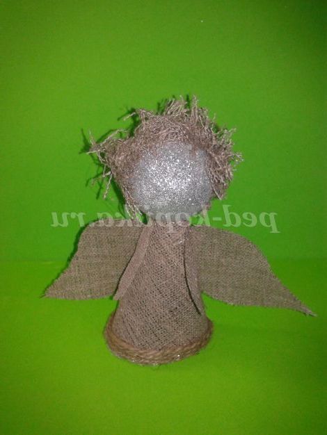 Коли всі заготовки висохли, починаємо збирати Янголятка. За допомогою гарячого клею склеюємо конус із заготівлі сукні. Низ сукні декоруємо шпагатом. Кріпимо крила на спині ляльки.
