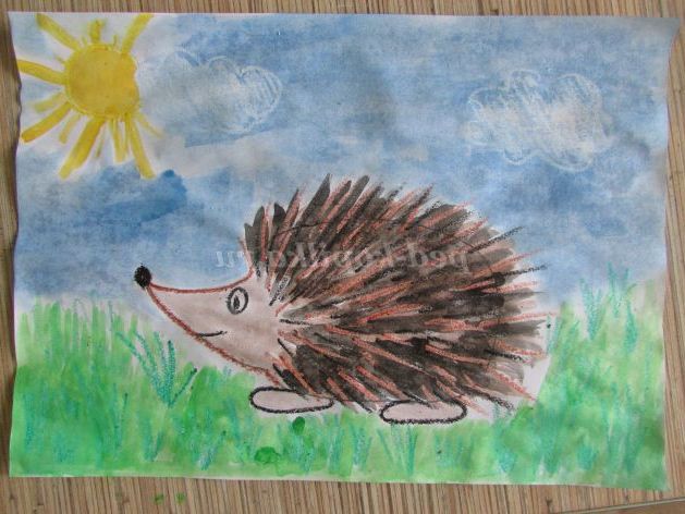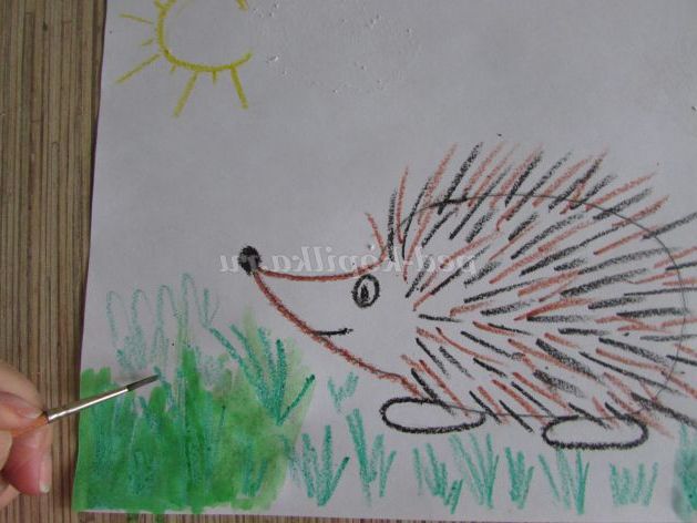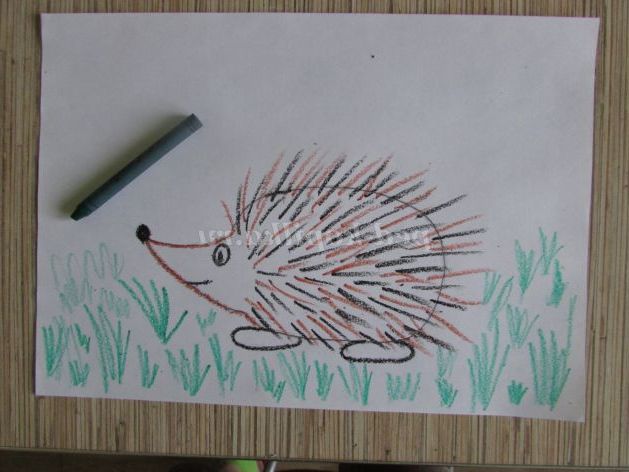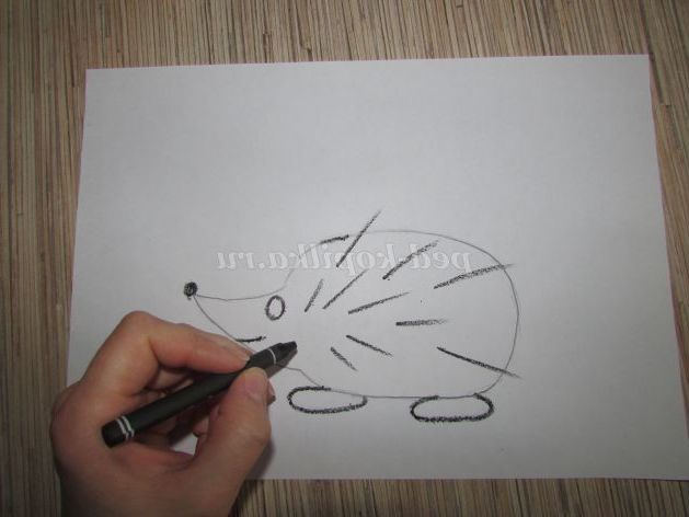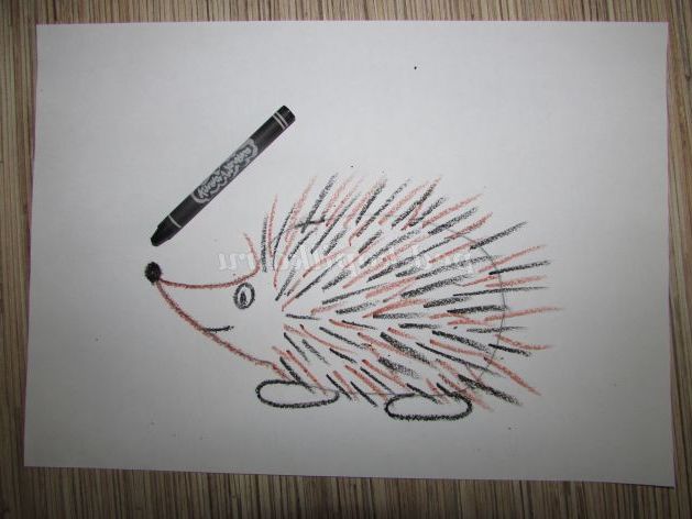 4.Обвести чорним восковим дрібному очей, ніжки, ніс. Штрихами почати малювати колючки