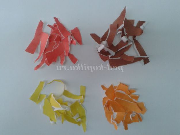 2. Потім з кольорового паперу способом обривання заготовимо смужки червоного, помаранчевого, жовтого і коричневого кольорів. Вони знадобляться для оформлення гриви лева.