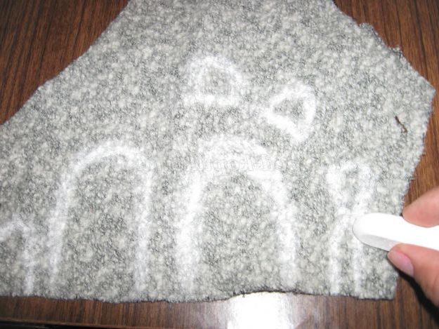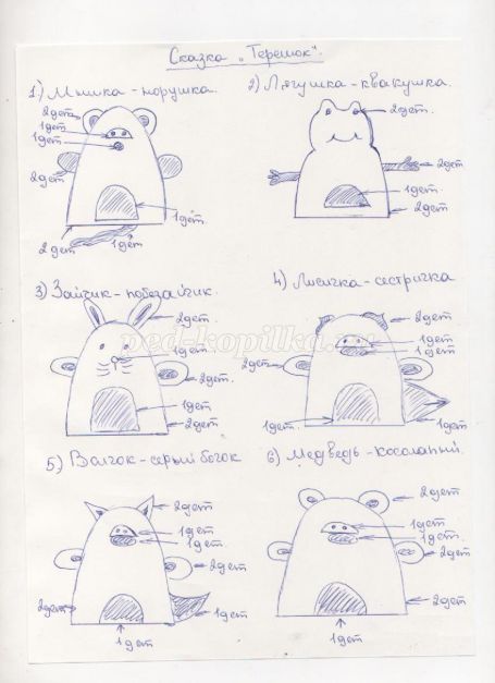 3. Таким же чином виготовляємо інших персонажів - Жабу - квакушку, зайчика - побегайчика, лисичку - сестричку, вовчка - сірого бочка і клишоногого ведмедя. Замальовуємо спочатку на тканини основні деталі.