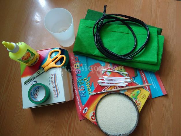 Матеріали: кольоровий папір, крепований папір, телефонний дріт, ватяні палички, кисть, пластилін, ізоляційна стрічка, клей, ножиці, акрилові фарби, манна крупа, склянка з водою.