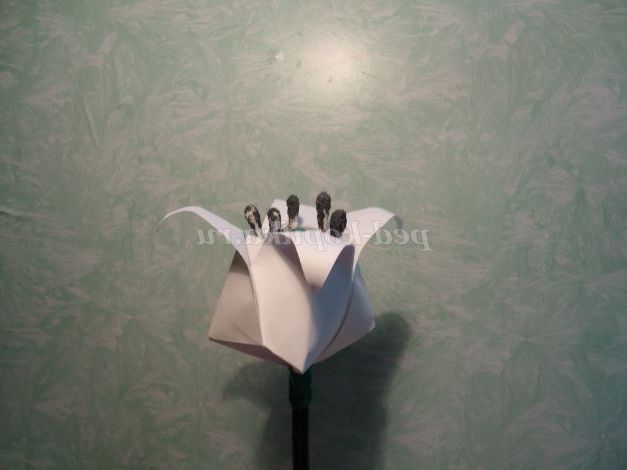 26.Просовываем готовий стеблинка через верхню частину тюльпана, знизу бутона тюльпана робимо чашечку ізолентою.