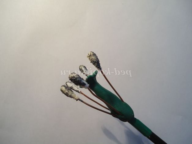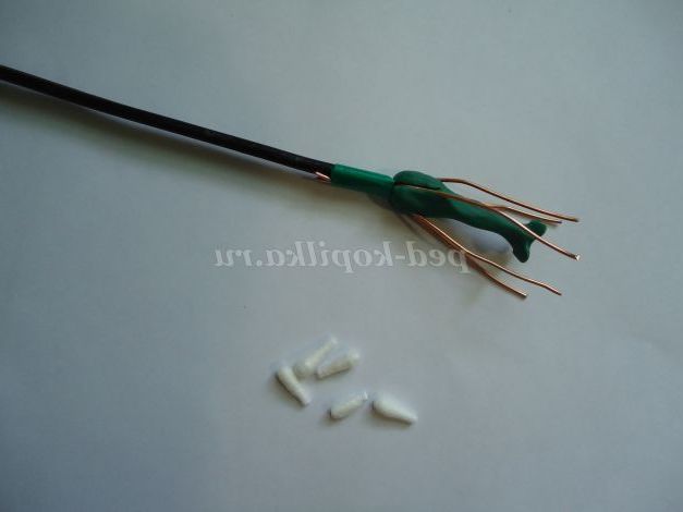 19.Нарезаем телефонний дріт для стеблинок тюльпанів. А для тюльпанів з відрізаними серцевинами очищаємо частина проводу, яку будемо використовувати як тичинки і нарізаємо його.