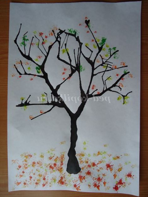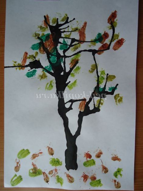 9. Не промиваючи кисть (кисть повинна залишатися сухою), капаємо воду в жовту фарбу, і робота виконується аналогічно. Листя виходять різнокольорові.