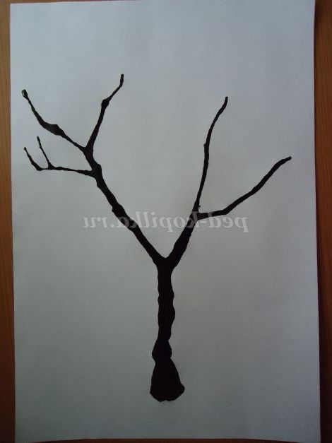 5. Потім більш інтенсивно дуємо на краплю, щоб вийшов стовбур (якщо туш швидко вбирається - це залежить від якості паперу, то додаємо 1-2 краплі на стовбур). Стовбур може вийти один або розділитися на кілька основних гілок.