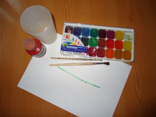 Матеріали: альбомний аркуш, туш, трубочка, два пензлі, склянка з водою, акварельні фарби.