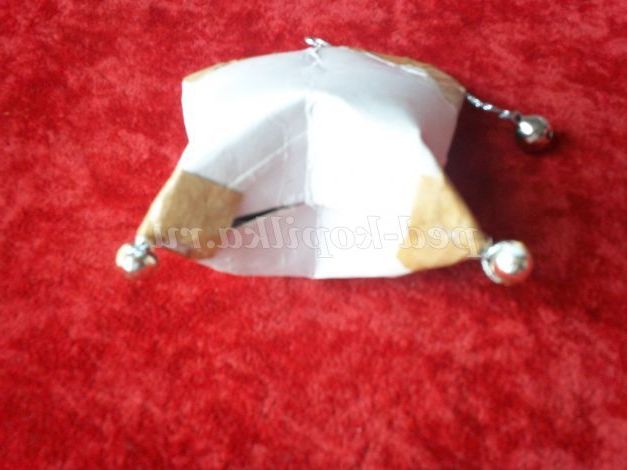 15. Коли лак висохне (не прилипає до рук) прив'язуємо золоті стрічки до колокольчику і до петельці. Робимо бантики.