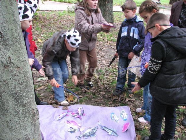 Реквізит: задекорованне озеро (синя тканина), 2 вудки з магнітиками, рибки паперові (із зворотного боку ребуси, на ротику скріпка), частина шифру.